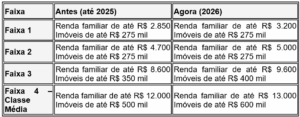 Com as mudanças, o programa passa a atender famílias com renda mensal de até R$ 13 mil, incluindo de forma mais ampla a classe média. Também houve aumento dos tetos dos imóveis financiáveis, que agora podem chegar a R$ 400 mil na Faixa 3 e a R$ 600 mil na Classe Média, enquanto as Faixas 1 e 2 seguem com limites regionais definidos de até 275 mil de acordo com o porte de cada municípios.